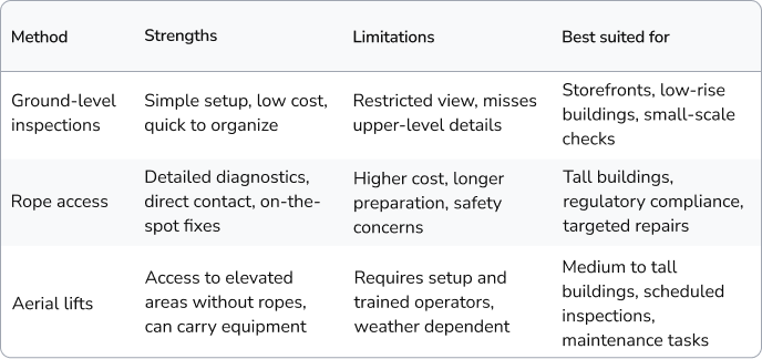 - Budget. Rope access and aerial lifts are more costly, because they involve trained staff, equipment, and safety protocols. Ground-level checks remain the least expensive, although their results are limited in scope.